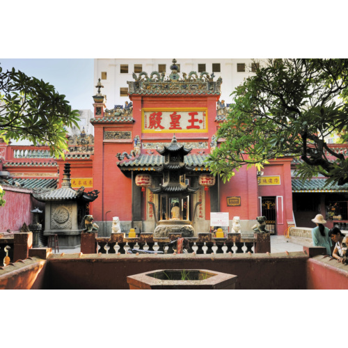 ... Образцом китайской архитектуры можно назвать пагоду Нефритового императора, она построена в 1909 году в честь верховного бога неба — Нгок Хоангу. Ее внешние стены и часовня-колонна на прихрамовой территории выкрашены в ярко-розовый цвет, на углах крыш размещены золоченые фигурки китайских львов. В главном зале находится множество скульптур буддийских и даосских божеств и статуя нефритового императора в окружении четырех молитвенно склоненных стражей. Далее расположена так называемая адская комната, на ее деревянных стенах представлены изображения 10 кругов ада и высится образ самого дьявола, но посетителей пагоды это не пугает. ...