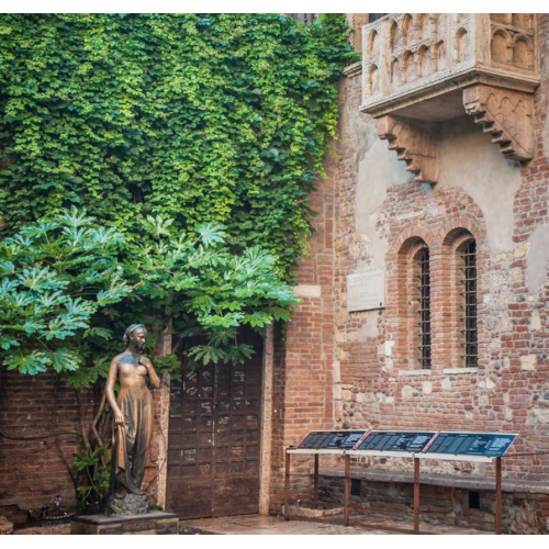 ... К старому дому с зеленым двориком и каменным балконом, принадлежавшему Капулетти, приходят толпы туристов, чтобы посмотреть на статую Джульетты и прикоснуться к великой любви. Красивая история продолжается и сегодня: драматурги пишут пьесы, режиссеры снимают фильмы и ставят спектакли, а зрители слушают и смотрят снова и снова. С высоты птичьего полета Верона выглядит розовой и прозрачной от красных черепичных крыш, мягкого речного воздуха, чистого и высокого и неба. Город живет неспешной, размеренной жизнью, хотя его улицы всегда наполнены суетой и звучит многоязычная речь туристов. Здесь много интересных исторических памятников и любопытных мест — арочных входов, за которыми неожиданно открываются тихие, уютные дворики с красивыми решетками, увитыми зеленью и цветами. ...