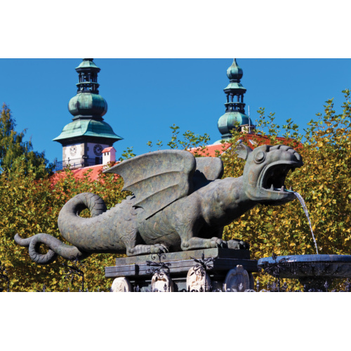 ... В самом центре на площади стоит фонтан Дракона (Линдвурмбруннен, XVI век). Согласно легенде, некогда горожанам не давал покоя страшный дракон, ныне увековеченный в камне и извергающий не пламя, а воду. В XVII столетии фонтан обнесли ажурной решеткой и добавили статую героя — победителя чудовища. ...