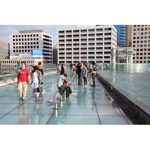 ... Все это накрыто овальной крышей длиной 106 м и шириной 36 м, выполненной из стекла и металла. Центр крыши заполняется водой и подсвечивается, причем разными цветами, которым соответствует определенное время суток. ...
