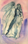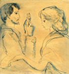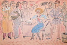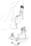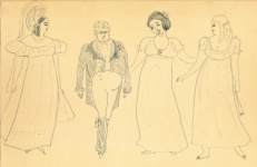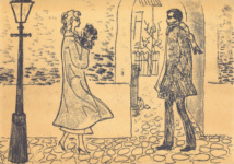 Рисунок «Татьяна в деревне, на именинах, в Петербурге» интересен композицией. Не совсем ясно, эскиз ли это, поиски образа или задумка художницы – показать пушкинскую героиню разной – у Рушевой есть несколько работ подобного рода на другие темы. Надя часто не следовала общепринятым правилам постро...
