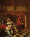 В картине, передающей эпизод из жизни городского дома, мастером заботливо перечислены мелкие, тонко подмеченные подробности. Чистый, прозрачный свет делает живопись правдоподобной, а две фигуры казались бы навечно заключенными в замкнутом мирке дворика, если бы не отворенная на улицу калитка. Отк...